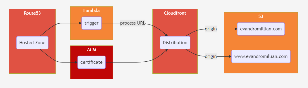During the tests with the Cloudfront distribution, I discovered that it doesn’t handle the URL format for Hugo sections (URL without a page name, /about or /portfolio).